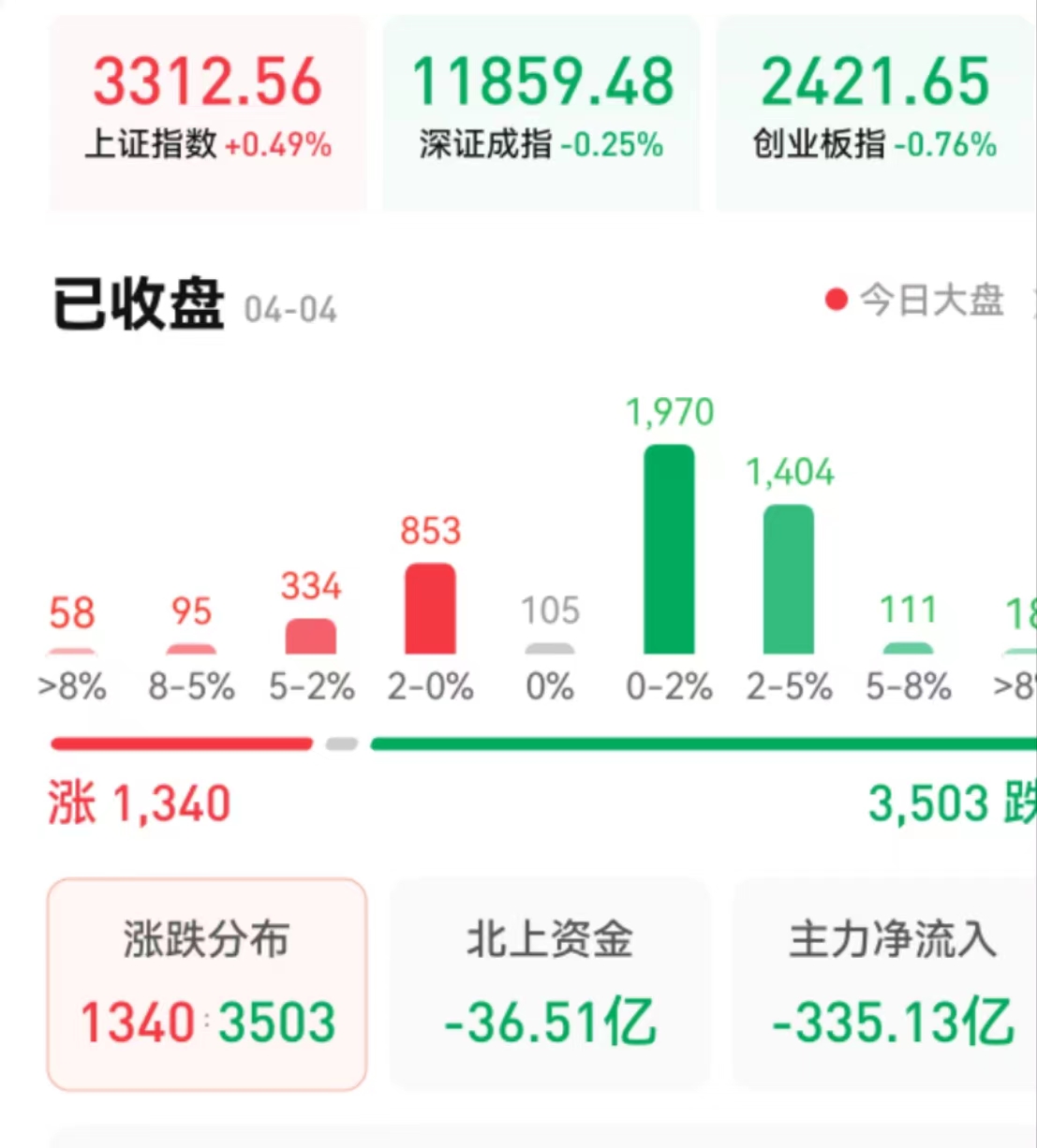 周二(4月4日),A股三大股指震蕩分化。截至收盤,上證指數(shù)漲0.49%,報3312.56點;深證成指跌0.25%,報11859.48點;創(chuàng)業(yè)板指跌0.76%,報2421.65點。兩市合計成交額13246億元,連續(xù)第2個交易日突破萬億元;北向資金凈賣出36.51億元;總體來看,A股個股跌多漲少,其中,漲停個股達26只,跌停個股達8只。