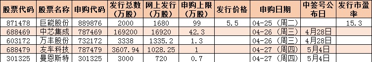 根據(jù)發(fā)行安排,下周(4月24日-28日)下周有5只新股申購(gòu),滬市主板1只、創(chuàng)業(yè)板1只、科創(chuàng)板2只、新三板1只。具體日程安排上,下周申購(gòu)日期在周二至周四,周二可申購(gòu)巨能股份,周三可申購(gòu)萬(wàn)豐股份、中芯集成,周四可申購(gòu)友車科技、曼恩斯特。