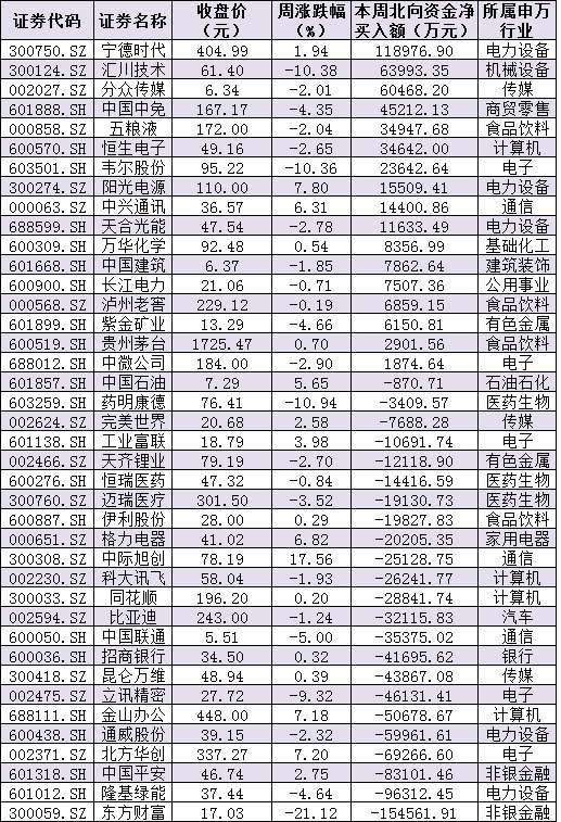 資金方面,本周北向資金先揚(yáng)后抑,前半周穩(wěn)步加倉(cāng),周五大幅凈賣出76.19億元,全周累計(jì)凈買入金額達(dá)3.39億元。從前十大成交活躍股來(lái)看,本周,寧德時(shí)代、匯川技術(shù)、分眾傳媒等3只個(gè)股,北向資金凈買入金額均超6億元。另外,東方財(cái)富、隆基綠能、中國(guó)平安等個(gè)股遭北向資金凈賣出金額均超8億元。