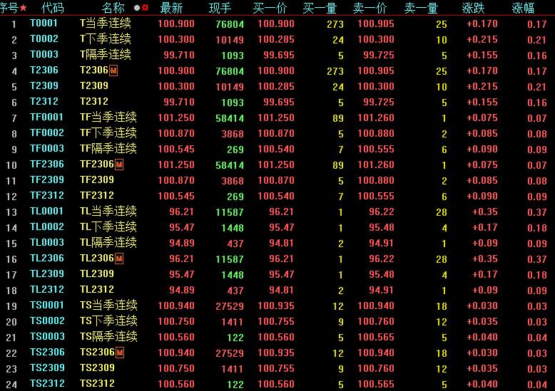 周五,30年期國(guó)債期貨上市首日收盤全線飄紅,6月合約漲0.37%,9月合約漲0.18%,12月合約漲0.09%。此外,10年期國(guó)債期貨主力合約漲0.17%,5年期主力合約漲0.07%,2年期主力合約漲0.03%。