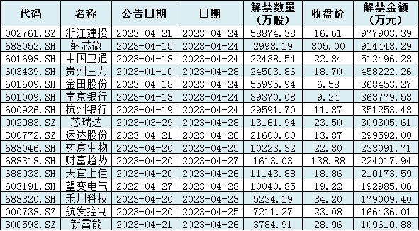 與此同時(shí),統(tǒng)計(jì)顯示,下周(4月24日-28日)共有70家公司限售股陸續(xù)解禁,按最新收盤價(jià)計(jì)算,解禁市值為657.97億元。從解禁市值來(lái)看,浙江建投(97.79億元)、納芯微(91.44億元)等公司解禁金額均超90億元。