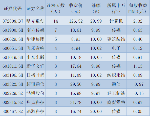 表:連續(xù)上漲3日且今日收盤(pán)漲停股一覽