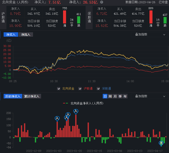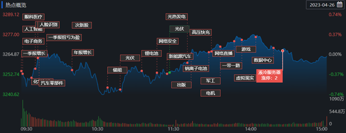4月26日,A股中小盤(pán)股在經(jīng)歷連續(xù)調(diào)整后趨于穩(wěn)定,并出現(xiàn)反彈。創(chuàng)業(yè)板指數(shù)表現(xiàn)強(qiáng)勁,盡管上證指數(shù)微跌,但交易時(shí)段內(nèi)出現(xiàn)較長(zhǎng)時(shí)間維持紅盤(pán)格局,A股市場(chǎng)的企穩(wěn)態(tài)勢(shì)已顯現(xiàn)。截至收盤(pán),上證指數(shù)跌0.02%報(bào)3264.10點(diǎn);深證成指漲0.33%報(bào)11185.68點(diǎn),創(chuàng)業(yè)板指漲1.54%報(bào)2294.06點(diǎn),A股合計(jì)成交額11236.06億元,較前一交易日增長(zhǎng)1.02%,北向資金凈買(mǎi)入7.51億元,滬股通凈買(mǎi)入0.79億元,深股通凈買(mǎi)入6.72億元??傮w上看,A股中漲多跌少,有3374只上漲,1501只下跌。
