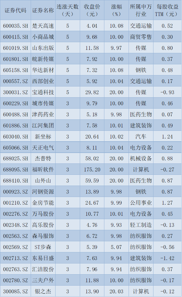 連續(xù)上漲3日且今日收盤漲停股一覽