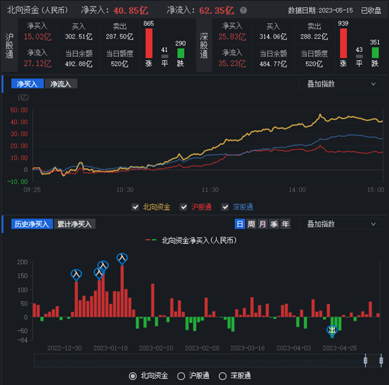 5月15日,截至收盤,上證指數(shù)漲1.17%報3310.74點,深證成指漲1.57%報11178.62點,創(chuàng)業(yè)板指漲2.11%報2299.93點;滬深兩市共成交9383億元。北向資金全天凈買入40.85億元,其中滬股通凈買入15.02億元,深股通凈買入25.83億元。今日A股中有3410只上漲,1366只下跌。