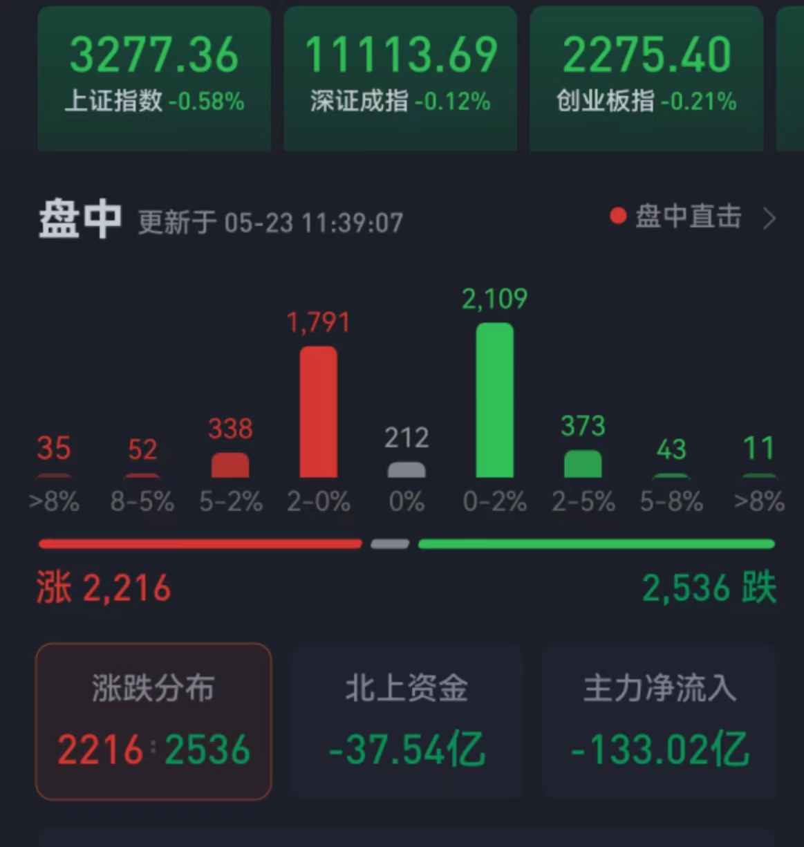 周二(5月23日),三大股指震蕩回落。截至上午收盤,上證指數(shù)跌幅達(dá)0.58%,報(bào)3277.36點(diǎn);深證成指跌幅達(dá)0.12%,創(chuàng)業(yè)板指漲幅為0.21%;滬深兩市合計(jì)成交額4782億元,總體來看,兩市個(gè)股跌多漲少。