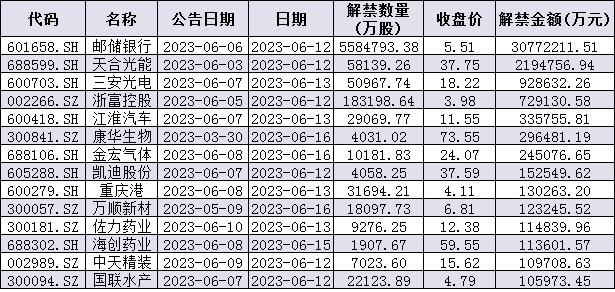 與此同時(shí),統(tǒng)計(jì)顯示,下周(6月12日-16日)共有89家公司限售股陸續(xù)解禁,按最新收盤價(jià)計(jì)算,解禁市值為3701.3億元。從解禁市值來看,郵儲(chǔ)銀行(3077.22億元)、天合光能(219.47億元)等公司解禁金額均超200億元。