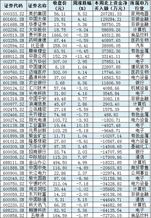 資金方面,本周北向資金累計(jì)凈買入金額達(dá)17.29億元。從前十大成交活躍股來看,本周,美的集團(tuán)、中國太保等2只個(gè)股,北向資金凈買入金額均超10億元。另外,五糧液、翱捷科技等個(gè)股遭北向資金凈賣出金額均超6億元。