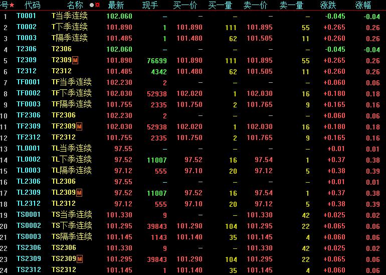 周五,國債期貨全線收漲,30年期主力合約漲0.38%,10年期主力合約漲0.26%,5年期主力合約漲0.18%,2年期主力合約漲0.06%。