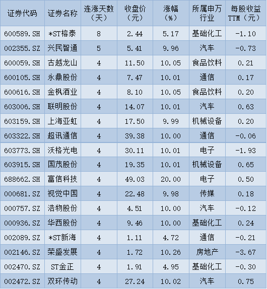 表:連續(xù)上漲4日且今日收盤漲停股一覽