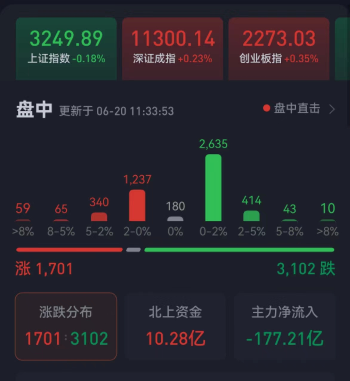 周二(6月20日),三大股指震蕩分化。截至上午收盤,上證指數(shù)跌0.18%,報3249.89點;深證成指和創(chuàng)業(yè)板指分別漲0.23%和0.35%;滬深兩市合計成交額6707.7億元,總體來看,兩市個股跌多漲少。
