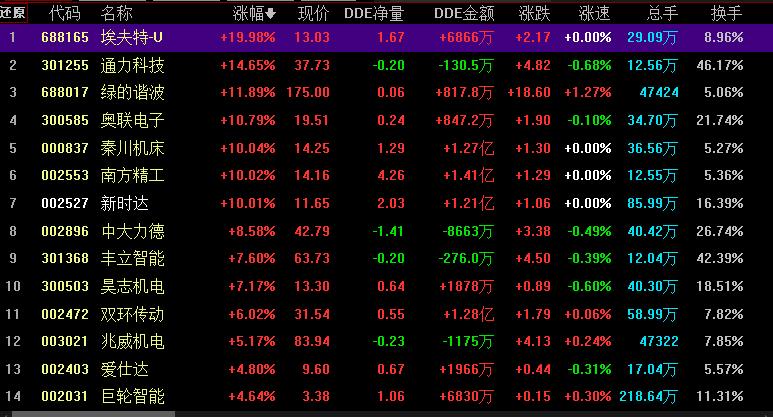 具體看,截至6月20日上午收盤,減速器板塊漲幅居首,達4.30%,資金凈流入達73.30億元。其中,埃夫特-U、通力科技、綠的諧波、奧聯(lián)電子、秦川機床、南方精工、新時達等概念股漲幅均超10%。
