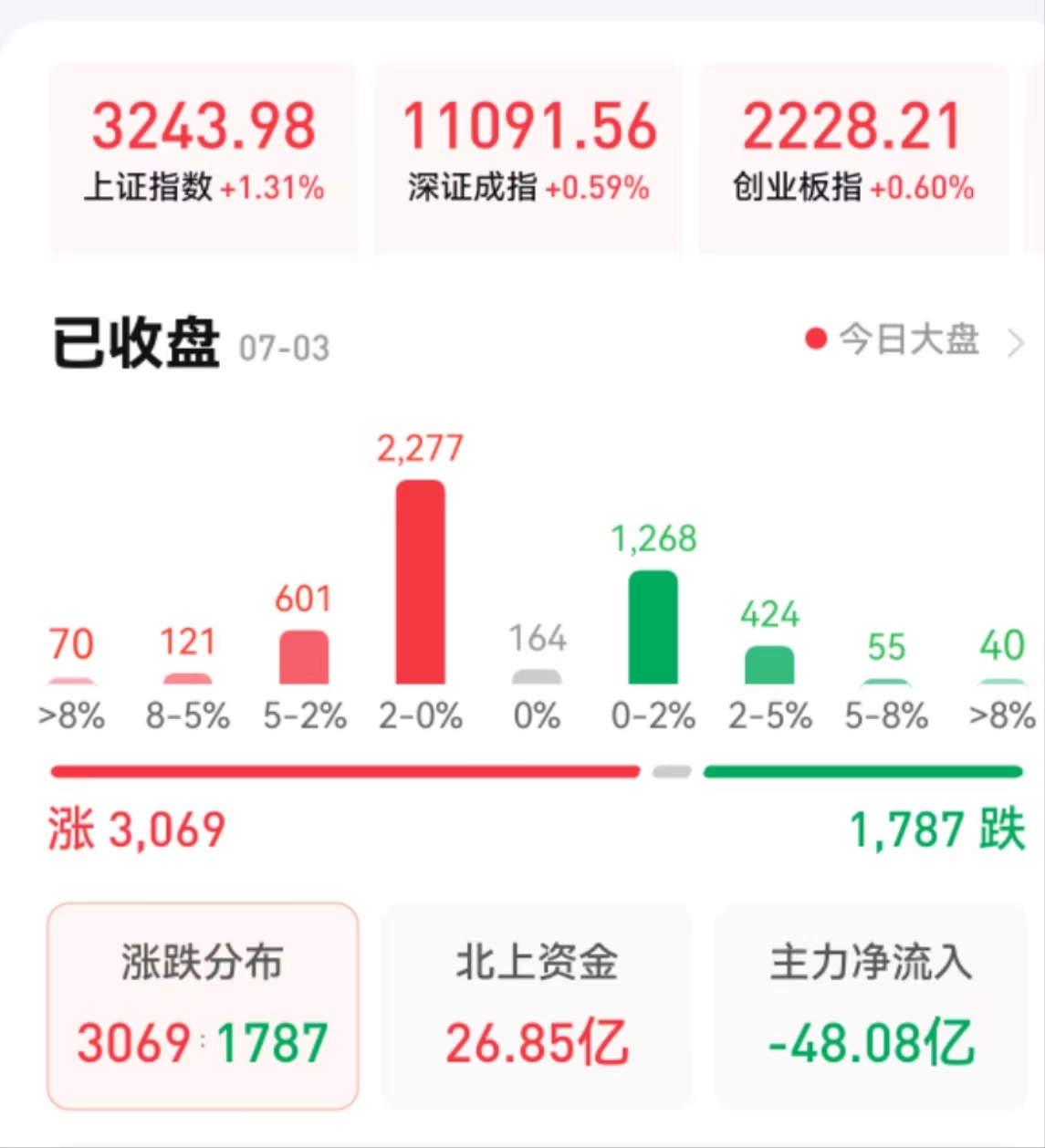周一(7月3日),A股三大股指震蕩上行,全線飄紅。截至收盤,上證指數(shù)漲1.31%報(bào)3243.98點(diǎn),深證成指漲0.59%報(bào)11091.56點(diǎn),創(chuàng)業(yè)板指漲0.6%報(bào)2228.21點(diǎn);滬深兩市合計(jì)成交額突破萬億元,達(dá)到10246億元,北向資金凈買入26.85億元??傮w上看,兩市個(gè)股漲多跌少。其中,漲停個(gè)股達(dá)58只,跌停個(gè)股達(dá)11只。