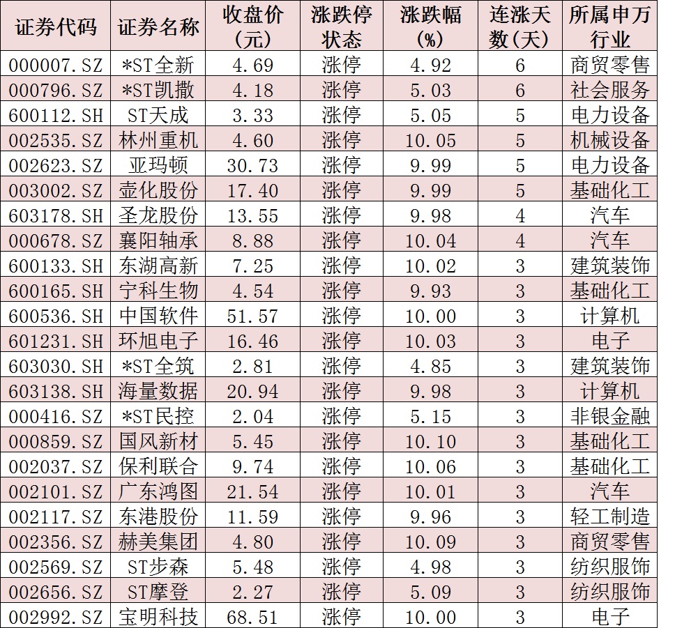 表:連續(xù)上漲3日且今日收盤漲停個(gè)股情況: