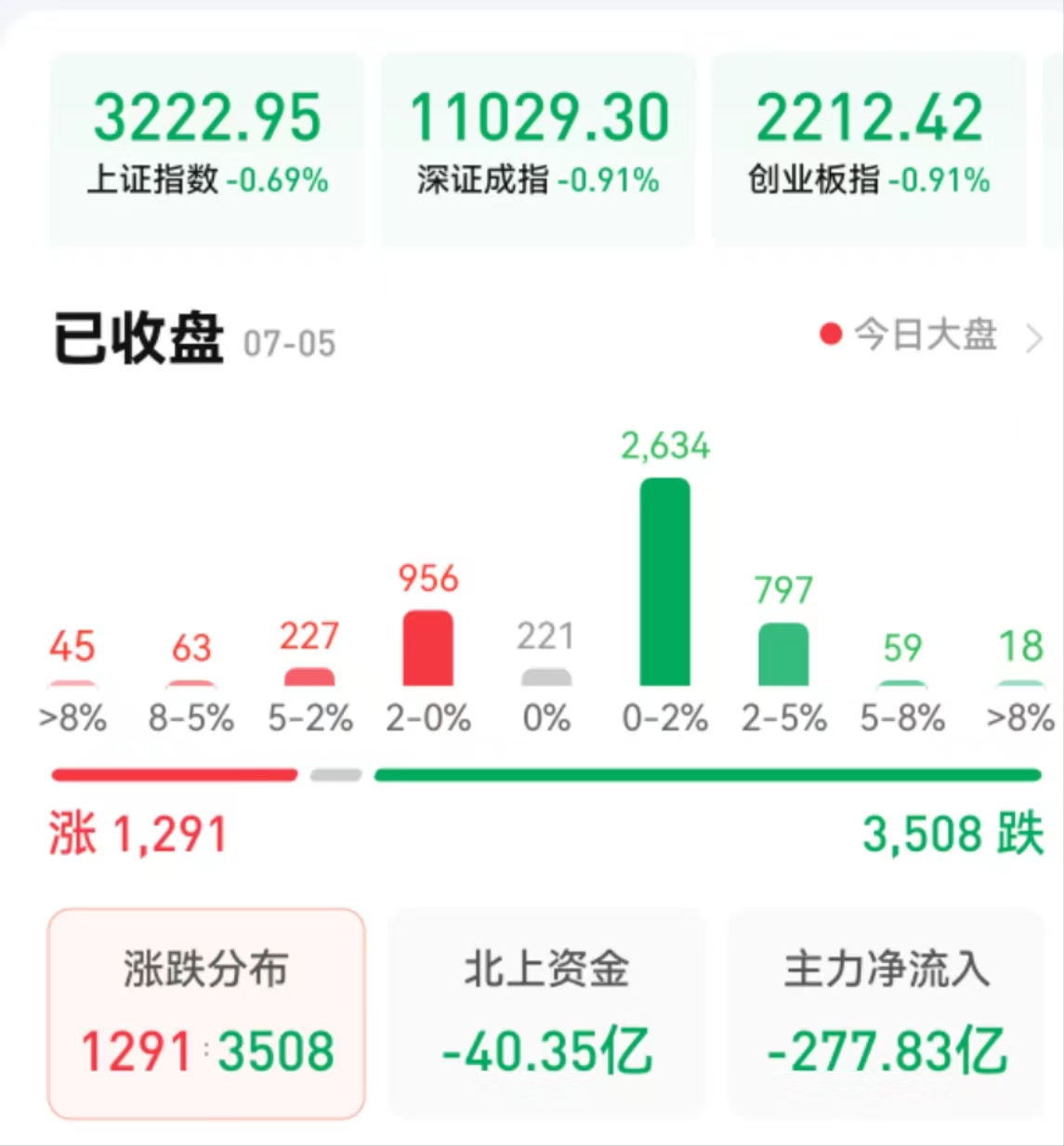周三(7月5日),A股三大股指震蕩回落。截至收盤,上證指數(shù)跌0.69%報(bào)3222.95點(diǎn),深證成指跌0.91%報(bào)11029.3點(diǎn),創(chuàng)業(yè)板指跌0.91%報(bào)2212.42點(diǎn);兩市合計(jì)成交金額達(dá)8678億元,北向資金凈賣出40.35億元??傮w上看,兩市個(gè)股跌多漲少。其中,漲停個(gè)股達(dá)34只,跌停個(gè)股達(dá)8只。