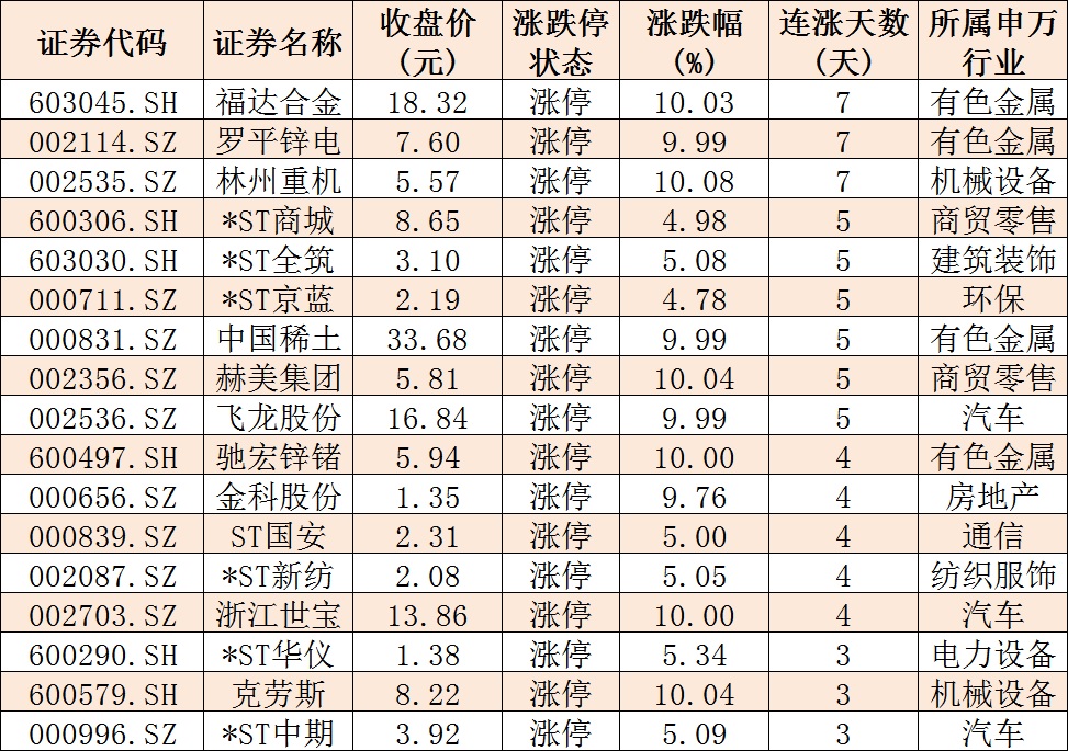 表:連續(xù)上漲3日且今日收盤漲停個(gè)股情況: