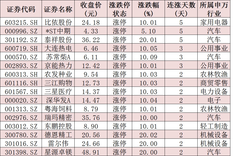 表:連續(xù)上漲2日且今日收盤漲停個(gè)股情況: