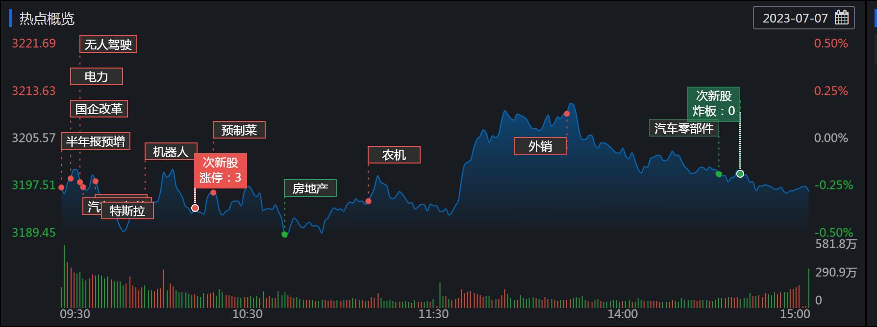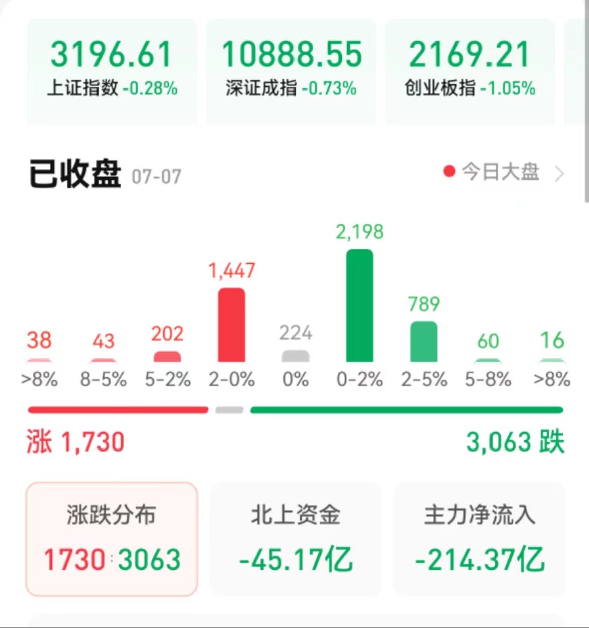 周五(7月7日),A股三大股指震蕩下行。截至收盤,上證指數(shù)跌0.28%報(bào)3196.61點(diǎn),深成指跌0.73%報(bào)10888.55點(diǎn),創(chuàng)業(yè)板指跌1.05%報(bào)2169.21點(diǎn);兩市合計(jì)成交金額達(dá)7998億元,北向資金凈賣出45.17億元??傮w上看,兩市個(gè)股跌多漲少,下跌個(gè)股超3000只,其中,漲停個(gè)股達(dá)27只,跌停個(gè)股達(dá)9只。