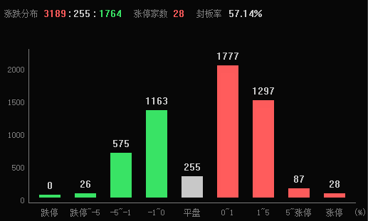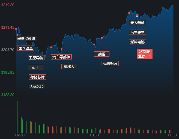 7月11日早盤,A股三大指數(shù)震蕩回升。截至上午11:30,上證指數(shù)漲0.48%,報3219.20點,深證成指和創(chuàng)業(yè)板指漲幅分別為0.57%和0.51%;滬深兩市成交額合計4670.7億元,較上一交易日同期縮減6.32%。A股市場有3189只個股上漲,1764只下跌,漲跌停方面,有28只個股漲停,沒有跌停。