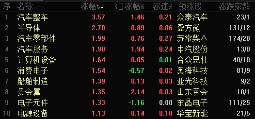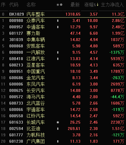 從早盤表現(xiàn)強勢的汽車整車行業(yè)看,交易中的24只成份股中,有23只上漲,其中,有3只個股漲幅超5%。資金方面,有11.3億元大單資金凈流入該行業(yè),居第2位。
