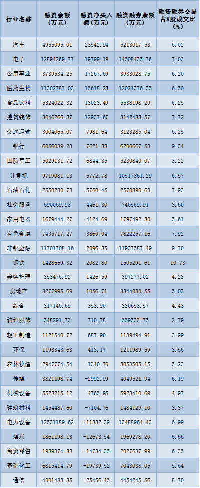 表:7月10日申萬一級行業(yè)兩融交易情況