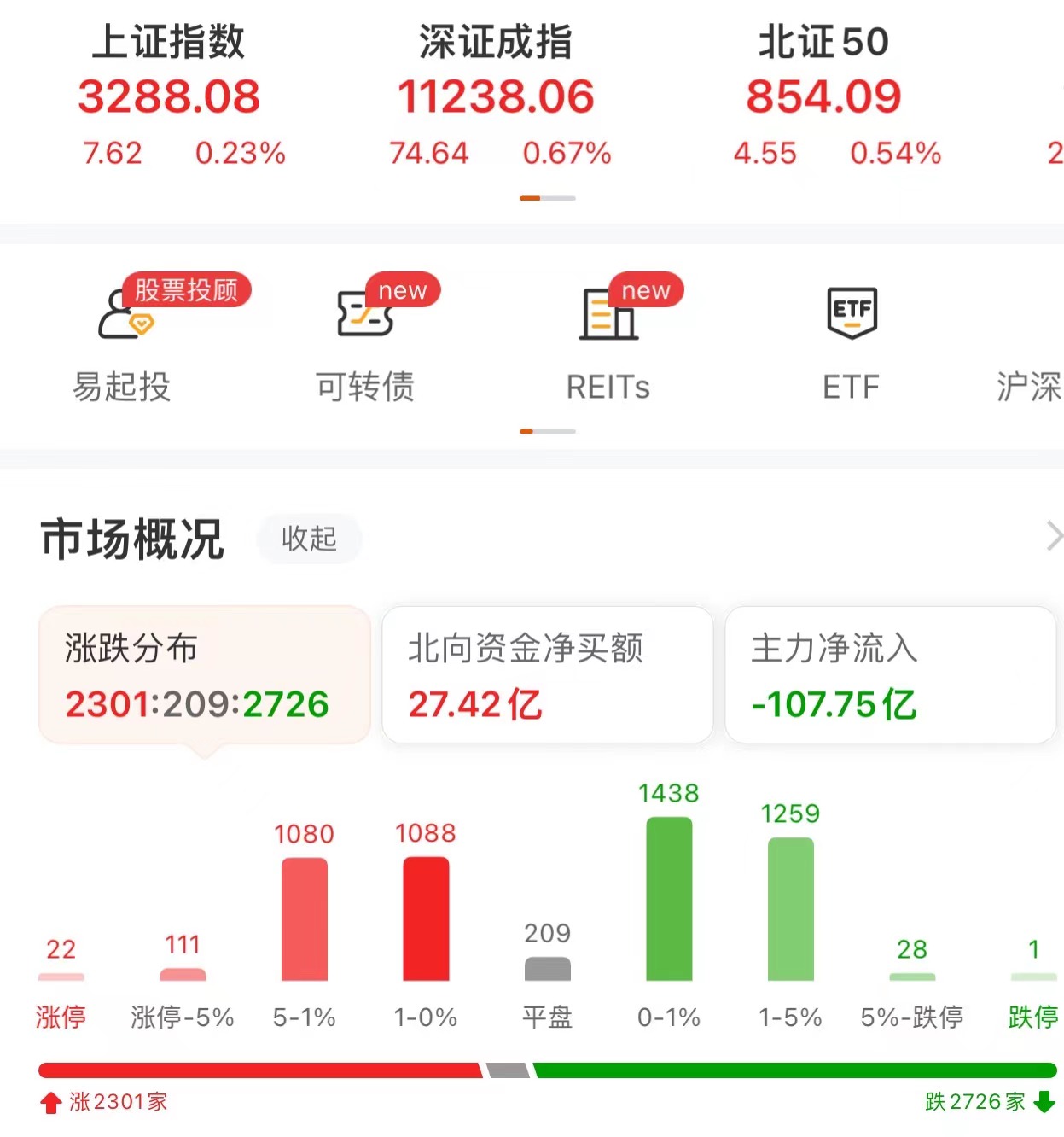 周五(8月4日),A股三大指數(shù)集體收漲,截至收盤,上證指數(shù)漲0.23%,深證成指漲0.67%,創(chuàng)業(yè)板指漲0.95%;滬深兩市合計(jì)成交額突破1萬億元,達(dá)到10491.6億元;北向資金凈買入27.42億元;總體來看,A股個(gè)股跌多漲少,上漲個(gè)股為2301只,下跌個(gè)股2726只。