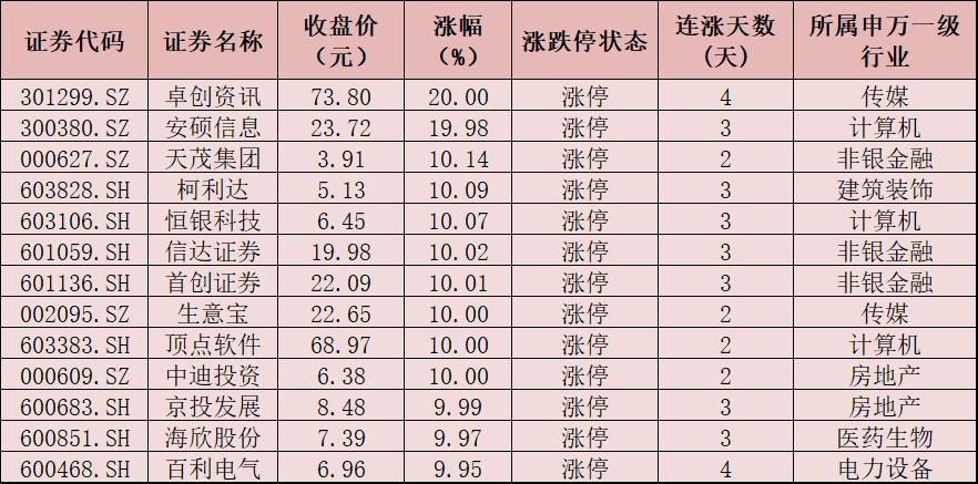 表:連續(xù)上漲2日且今日收盤漲停個(gè)股情況: