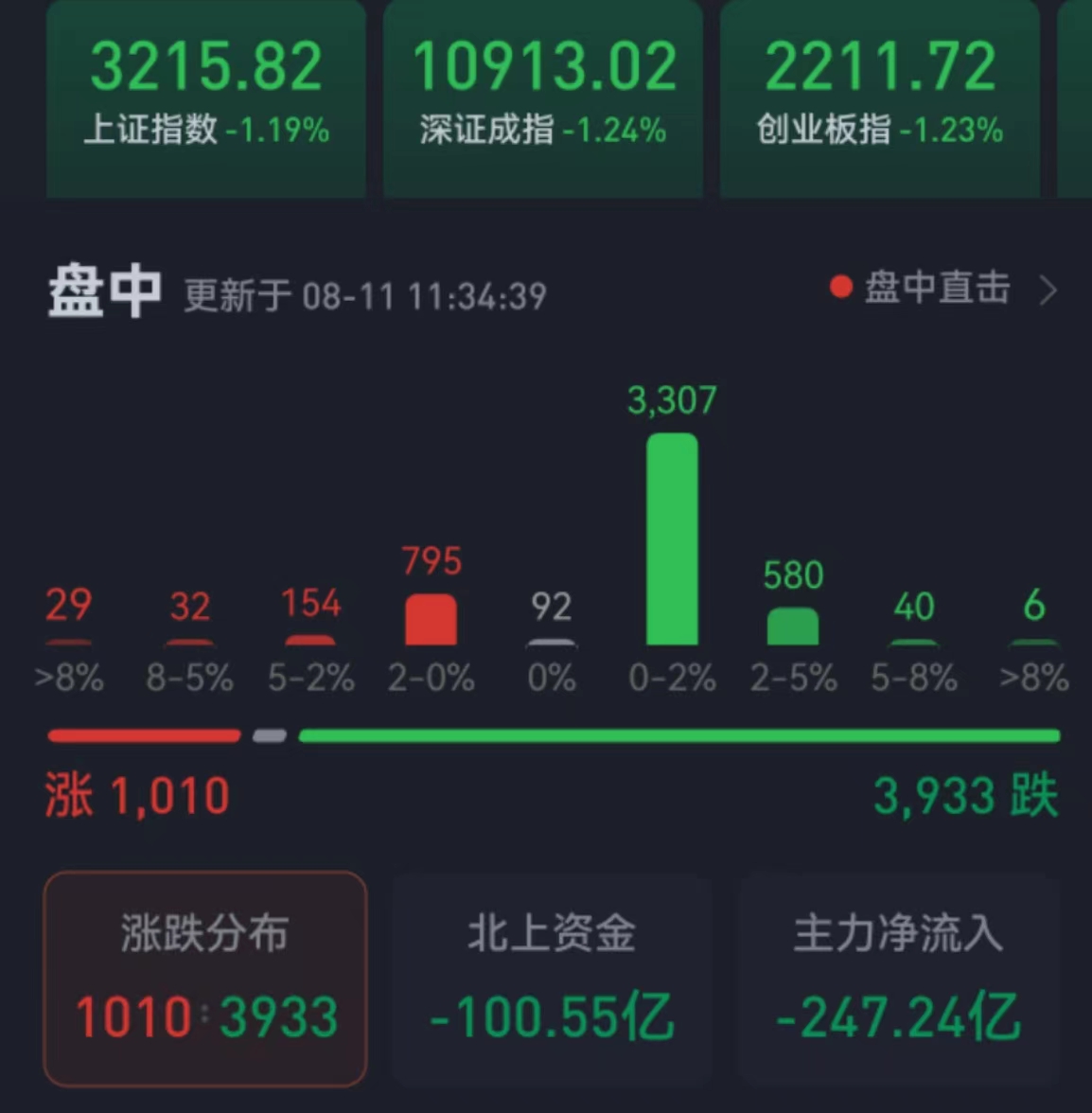 周五(8月11日),三大股指繼續(xù)震蕩回落。截至上午收盤,上證指數(shù)跌1.19%,報3215.82點;深證成指和創(chuàng)業(yè)板指跌幅分別為1.24%和1.23%;滬深兩市合計成交額4668.5億元,總體來看,兩市個股跌多漲少,其中,近4000只個股出現(xiàn)下跌。