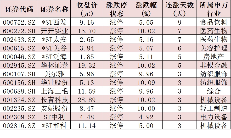 表:連續(xù)上漲3日且今日收盤漲停個(gè)股情況: