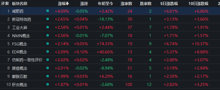 熱點(diǎn)方面,截至9月12日上午收盤,醫(yī)藥板塊再度活躍,減肥藥領(lǐng)漲,新冠特效藥、工業(yè)大麻、蒙脫石散、F5G概念等板塊漲幅居前。下跌方面,光刻膠、電子化學(xué)品、房地產(chǎn)服務(wù)、酒店及餐飲等板塊跌幅居前。