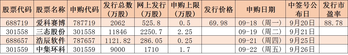 根據(jù)發(fā)行安排,下周(9月18日-22日)暫定有4只新股發(fā)行,科創(chuàng)板、創(chuàng)業(yè)板各2只。浩辰軟件和愛科賽博將登陸科創(chuàng)板,中集環(huán)科和三態(tài)股份則選擇了創(chuàng)業(yè)板。