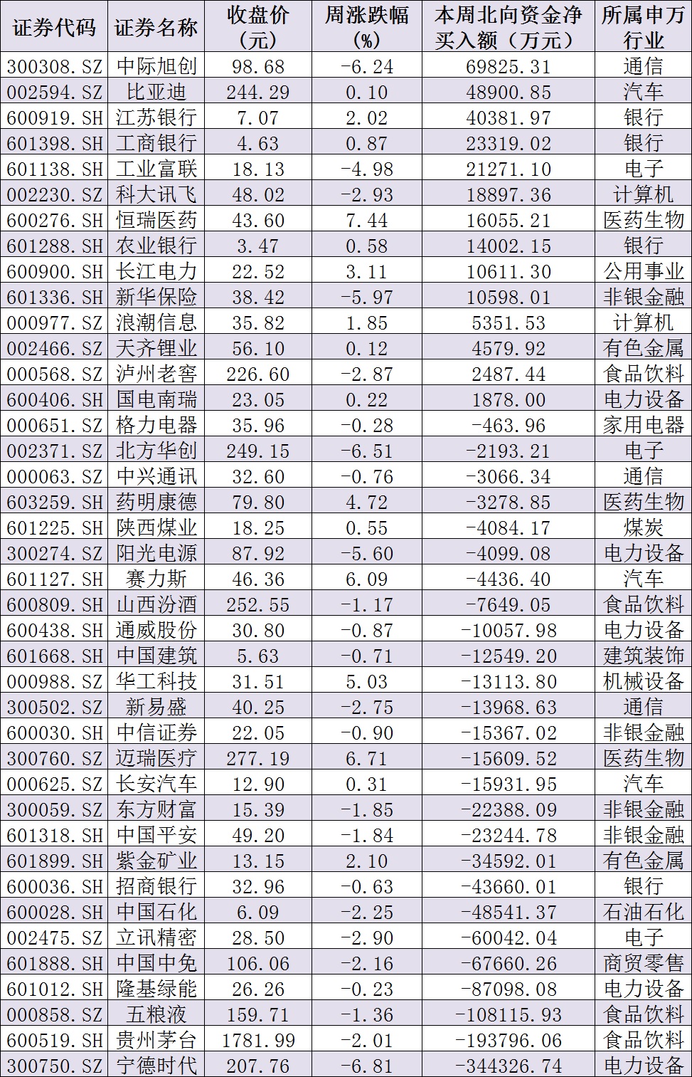 資金方面,本周北向資金累計凈賣出金額達152.06億元。從前十大成交活躍股來看,本周,中際旭創(chuàng)、比亞迪、江蘇銀行等3只個股,北向資金凈買入金額均超4億元。另外,寧德時代、貴州茅臺、五糧液等個股遭北向資金凈賣出金額均超10億元。