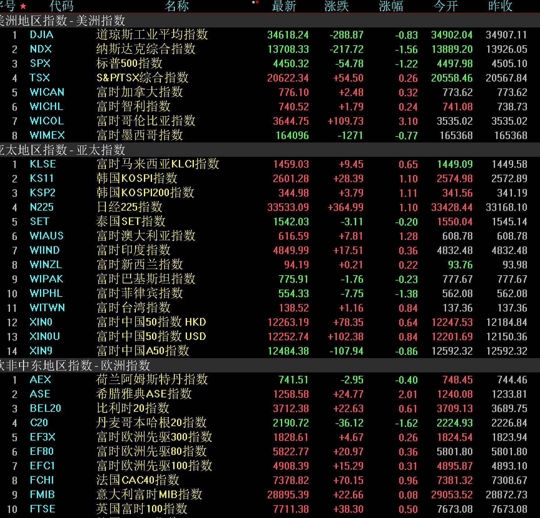 周五,美國三大股指全線收跌,道指跌0.83%報34618.24點,標普500指數(shù)跌1.22%報4450.32點,納指跌1.56%報13708.34點。本周,道指漲0.12%,標普500指數(shù)跌0.16%,納指跌0.39%。