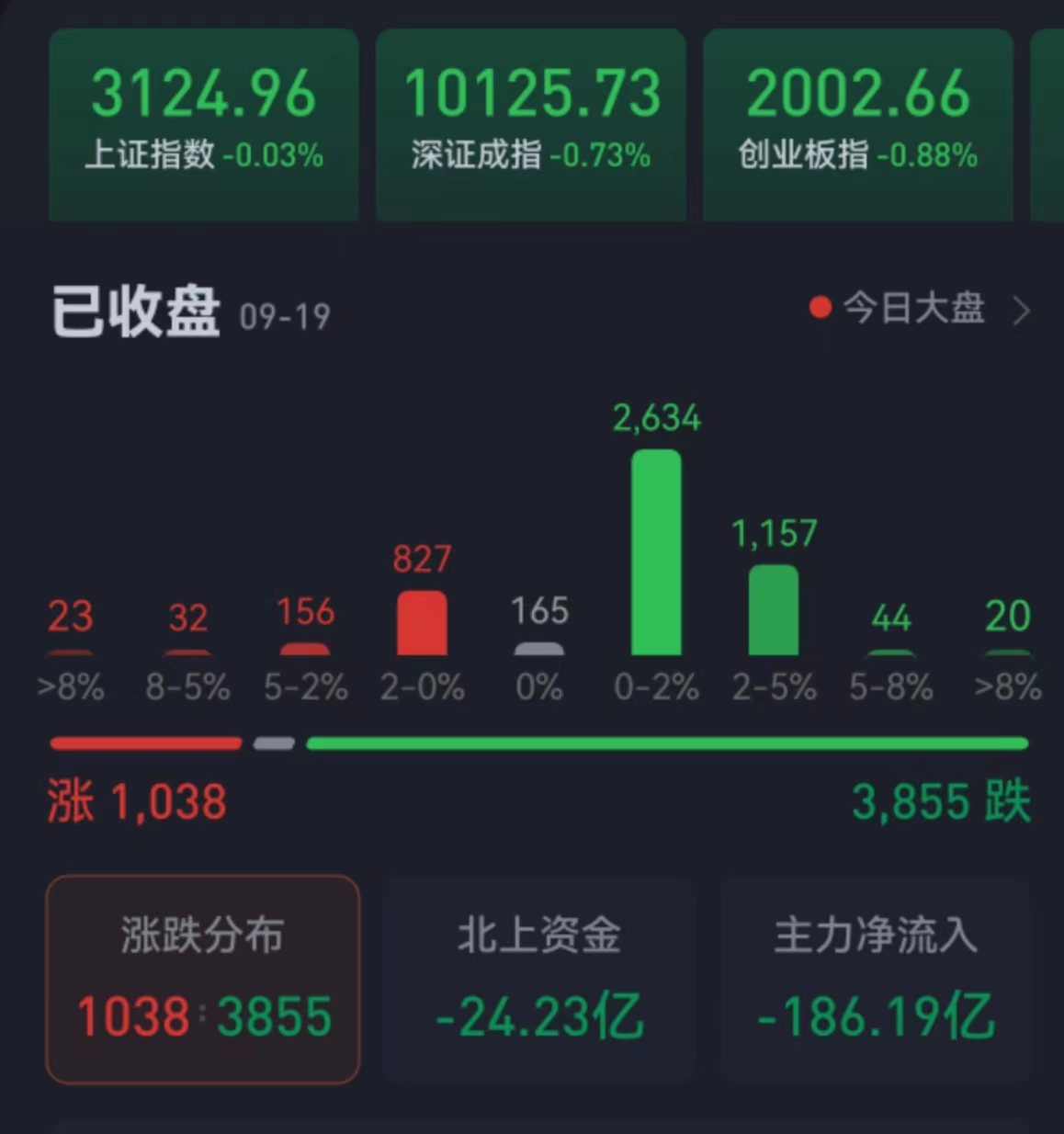 周二(9月19日),A股三大股指震蕩整理。截至收盤,上證指數(shù)微跌0.03%報3124.96點,深證成指跌0.73%報10125.73點,創(chuàng)業(yè)板指跌0.88%報2002.66點;兩市合計成交6349.65億元,創(chuàng)年內(nèi)新低。北向資金凈賣出額達(dá)24.23億元??傮w上看,兩市個股跌多漲少,超3800只個股下跌。其中,漲停個股達(dá)33只,跌停個股達(dá)9只。