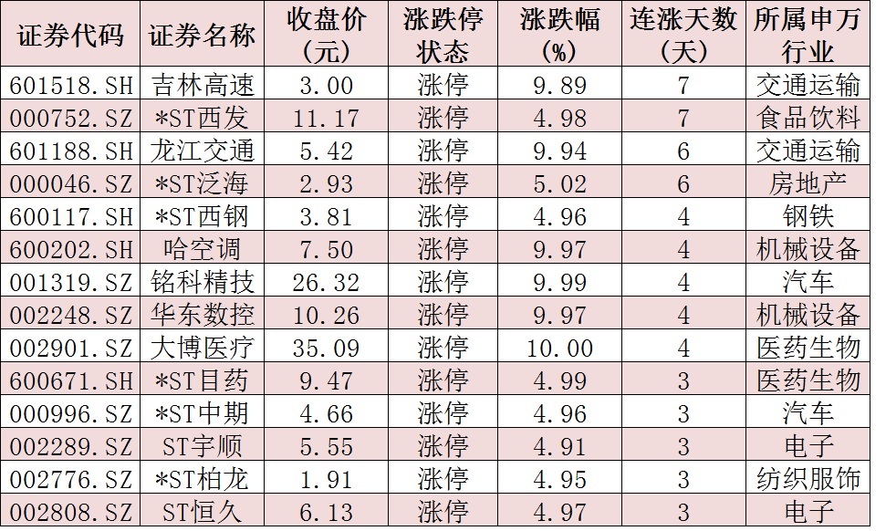 表:連續(xù)上漲3日且今日收盤漲停個股情況:
