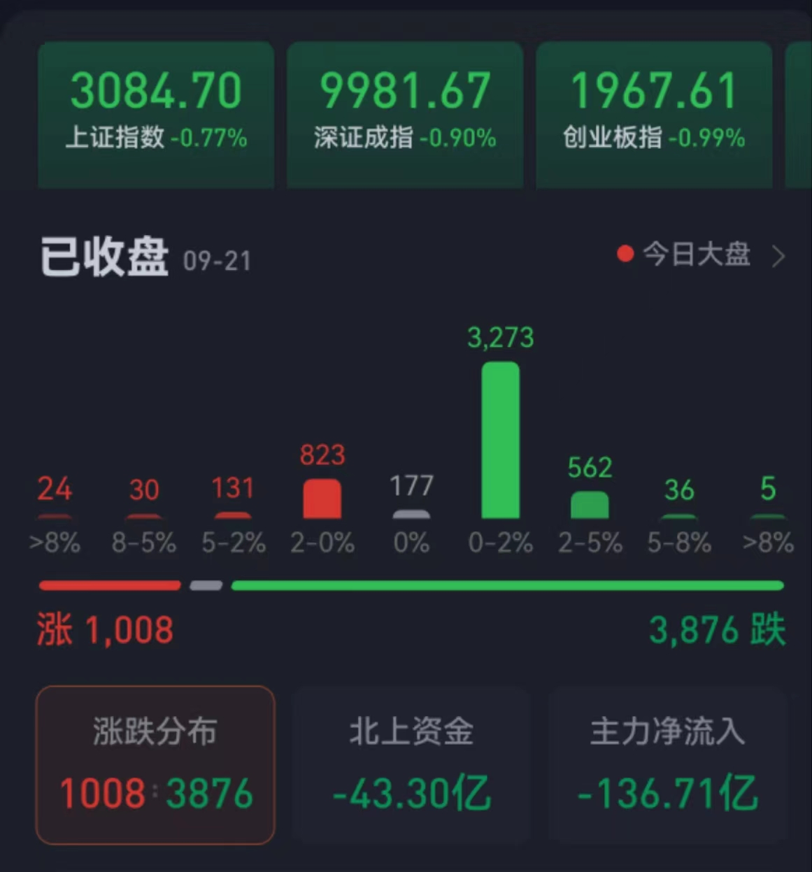 周四(9月21日),A股三大股指震蕩下行,全線收綠。截至收盤,上證指數(shù)跌0.77%報3084.7點,深證成指跌0.90%報9981.67點,創(chuàng)業(yè)板指跌0.99%報1967.61點;兩市合計成交金額5790.26億元,北向資金凈賣出43.30億元??傮w上看,兩市個股跌多漲少。不過,從漲跌停情況看,漲停個股達(dá)29只,跌停個股無。