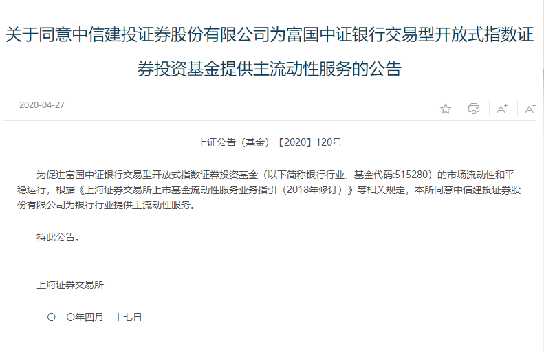 上交所4月27日公告,同意中信建投證券股份有限公司為富國中證銀行交易型開放式指數(shù)證券投資基金(簡稱:銀行行業(yè),基金代碼:515280)提供主流動性服務(wù)。