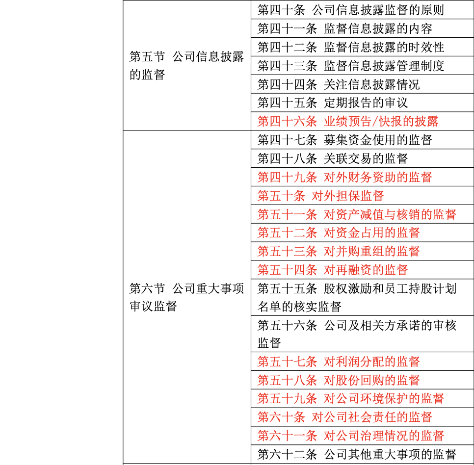 在增加監(jiān)管關(guān)注要點(diǎn)方面,根據(jù)近年來監(jiān)管關(guān)注要點(diǎn),《指引》增加相應(yīng)條目,如對財(cái)務(wù)會計(jì)報(bào)告的監(jiān)督;業(yè)績預(yù)告/快報(bào)的披露監(jiān)督;對外財(cái)務(wù)資助、對外擔(dān)保、資產(chǎn)減值與核銷、資金占用、并購重組、再融資、利潤分配、股份回購、公司環(huán)境保護(hù)、公司社會責(zé)任和公司治理情況的監(jiān)督等。