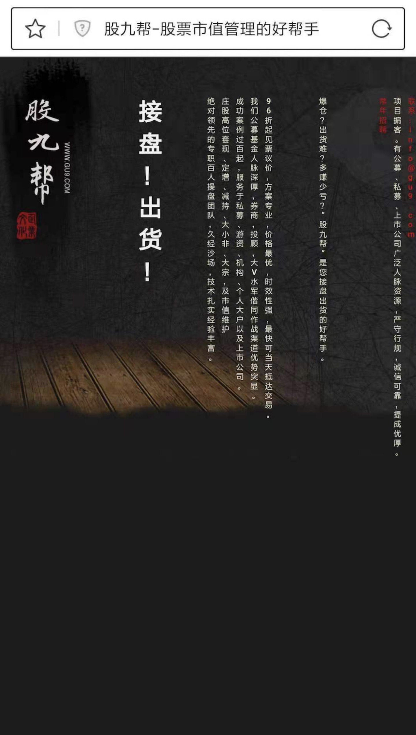“盤后票網站有了影響力之后,吳承澤成立了股九幫項目,專門收取傭金幫別人出貨。吳承澤前一天在盤后票網站上掛出要出貨的股票,第二天莊家就可以出貨??梢赃x擇由吳承澤團隊來操作賬戶,也可以莊家自己操作賬戶。”陳偉杰進一步解釋道。
