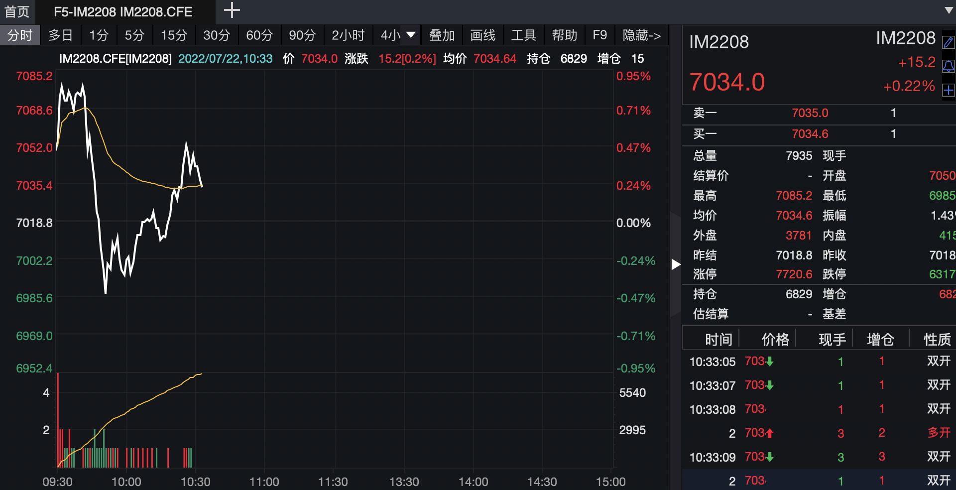 2022年7月22日上午,中證1000股指期貨和期權(quán)相關(guān)合約在中國金融期貨交易所(以下簡稱“中金所”)成功掛牌上市。截至當(dāng)日10點半,中證1000股指期貨主力合約IM2208上漲0.22%,成交量7935手。