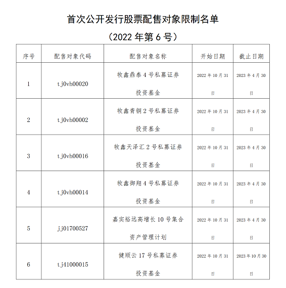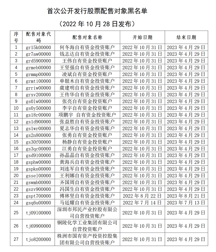 本報(bào)訊 10月28日,中證協(xié)發(fā)布《首次公開發(fā)行股票配售對(duì)象限制名單公告(2022年第6號(hào))》和《首次公開發(fā)行股票配售對(duì)象黑名單公告(2022年第8號(hào))》。