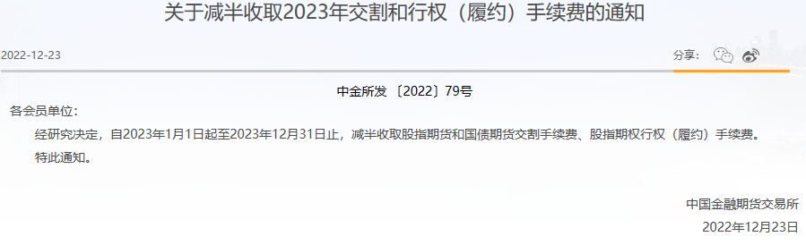此外,中金所也發(fā)布相關(guān)手續(xù)費減免通知,決定減半收取2023年交割和行權(quán)(履約)手續(xù)費。