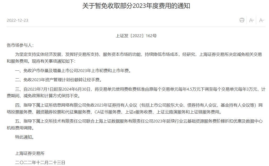 12月23日,滬深交易所分別發(fā)布減免2023年度相關(guān)費用的通知,決定免收2023年上市公司上市初費和上市年費。