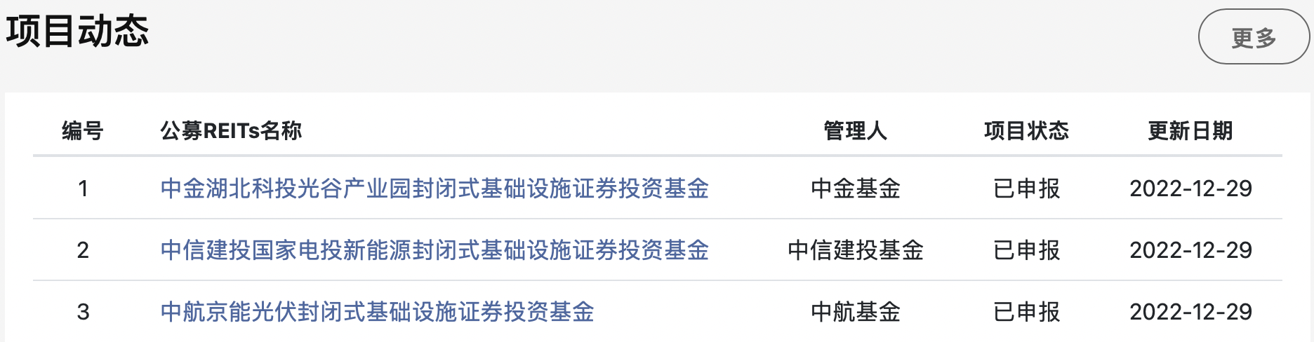 這3單公募REITs分別為中信建投國家電投新能源封閉式基礎設施證券投資基金、中航京能光伏封閉式基礎設施證券投資基金、中金湖北科投光谷產(chǎn)業(yè)園封閉式基礎設施證券投資基金,目前項目狀態(tài)為“已申報”。