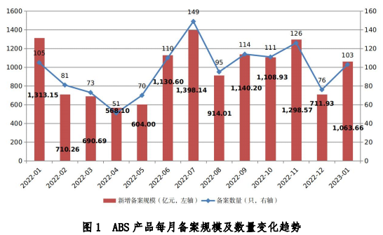 2月22日,中基協(xié)發(fā)布2023年1月份《企業(yè)資產(chǎn)證券化業(yè)務(wù)備案運行情況簡報》顯示,2023年1月份,企業(yè)資產(chǎn)證券化產(chǎn)品共備案確認103只,新增備案規(guī)模合計1063.66億元。1月份新增備案規(guī)模環(huán)比增長49.41%,同比減少19.00%。