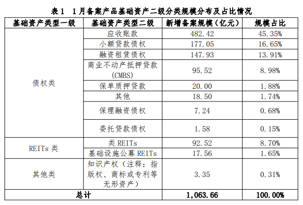 按基礎(chǔ)資產(chǎn)一級分類,1月份債權(quán)類產(chǎn)品新增備案規(guī)模950.24億元;REITs類產(chǎn)品新增備案規(guī)模110.08億元;其他類產(chǎn)品新增備案規(guī)模3.35億元。按基礎(chǔ)資產(chǎn)二級分類,小額貸款債權(quán)、應(yīng)收賬款、融資租賃債權(quán)、商業(yè)不動產(chǎn)抵押貸款(CMBS)新增備案規(guī)模合計占月度備案產(chǎn)品新增備案規(guī)模的84.89%,較上月增長18.17%。