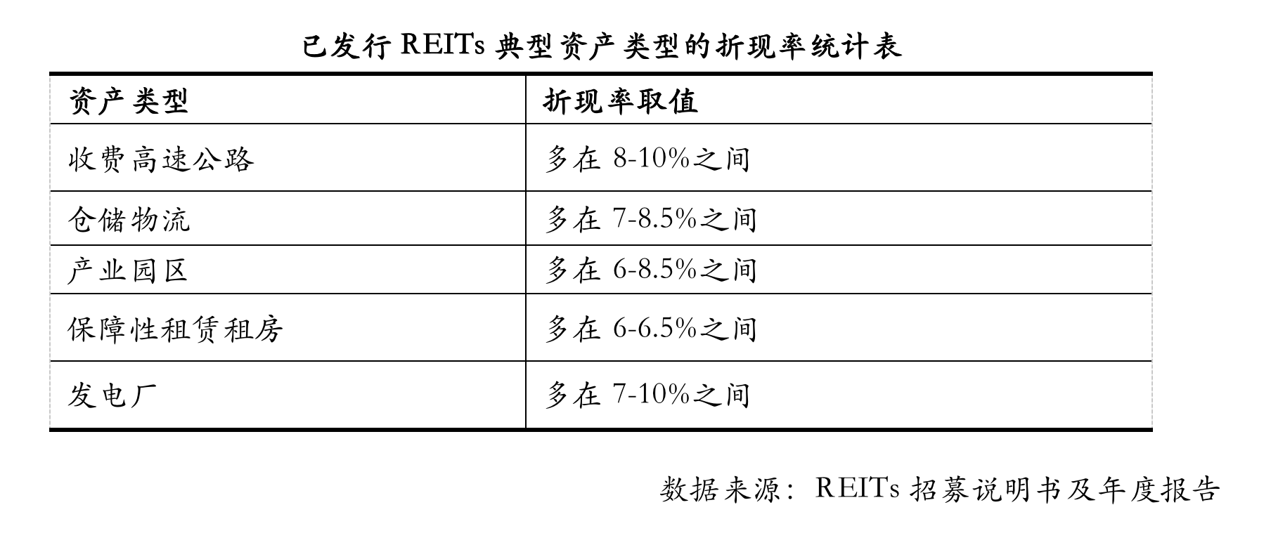 目前特許經(jīng)營(yíng)權(quán)類REITs主要采用了加權(quán)平均資本成本法(WACC),產(chǎn)權(quán)類REITs主要采用了累加法(無(wú)風(fēng)險(xiǎn)收益率加風(fēng)險(xiǎn)調(diào)整值)進(jìn)行測(cè)算。由于預(yù)期回報(bào)、資本成本、市場(chǎng)利率、資產(chǎn)類型和分布城市、區(qū)位等多方面影響因素的不同,不同資產(chǎn)類型折現(xiàn)率有較明顯的差異。已發(fā)行REITs典型資產(chǎn)類型的折現(xiàn)率統(tǒng)計(jì)如下: