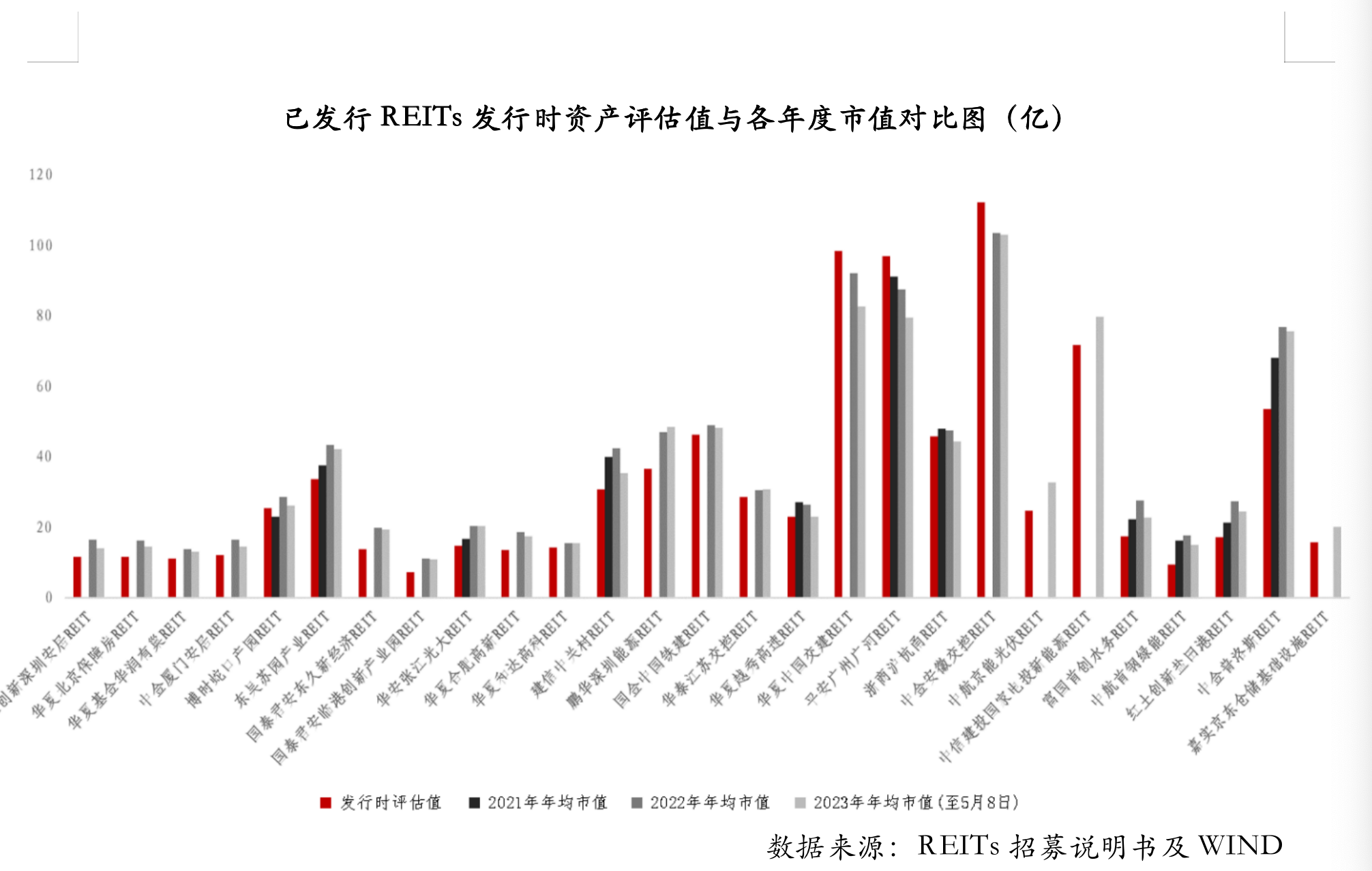 不同于股票,REITs底層的基礎(chǔ)設(shè)施資產(chǎn)未來(lái)可帶來(lái)穩(wěn)定、可預(yù)期的收益以及REITs具有強(qiáng)制收益分配的特性,這體現(xiàn)了REITs的本源和特點(diǎn)——長(zhǎng)期穩(wěn)定的收益,其更加適合于長(zhǎng)期投資和價(jià)值投資。盡管資本市場(chǎng)波動(dòng)風(fēng)險(xiǎn)不可避免,但REITs的底層資產(chǎn)收益和價(jià)值的穩(wěn)定性,決定了REITs市值只在一定范圍內(nèi)波動(dòng)調(diào)整。因此某種意義上,基礎(chǔ)設(shè)施的評(píng)估價(jià)值是REITs投資的壓艙石,其錨定了REITs投資價(jià)值。如同價(jià)格與價(jià)值的關(guān)系,價(jià)格總是圍繞價(jià)值上下波動(dòng),而無(wú)法脫離其內(nèi)在價(jià)值的影響。如下所示,已發(fā)行REITs發(fā)行時(shí)資產(chǎn)評(píng)估值與各年度市值對(duì)比圖,反映了如上事實(shí)。