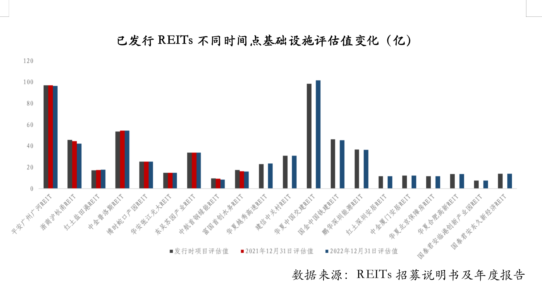 由于基礎(chǔ)設(shè)施收益期遞減的特性,短期內(nèi)雖然價(jià)值一般變化較小,但長(zhǎng)期來(lái)看REITs有著價(jià)值遞減的內(nèi)在因素,但產(chǎn)權(quán)類REITs的收益期一般較長(zhǎng)且具有一定的增值性,某種程度上可抵消一定的影響。不同資產(chǎn)類型價(jià)值評(píng)估差異較大,因此REITs投資者應(yīng)時(shí)常關(guān)注評(píng)估價(jià)值的變化,把握投資機(jī)遇。如下所示,已發(fā)行REITs短期內(nèi)基礎(chǔ)設(shè)施評(píng)估值變化不大。