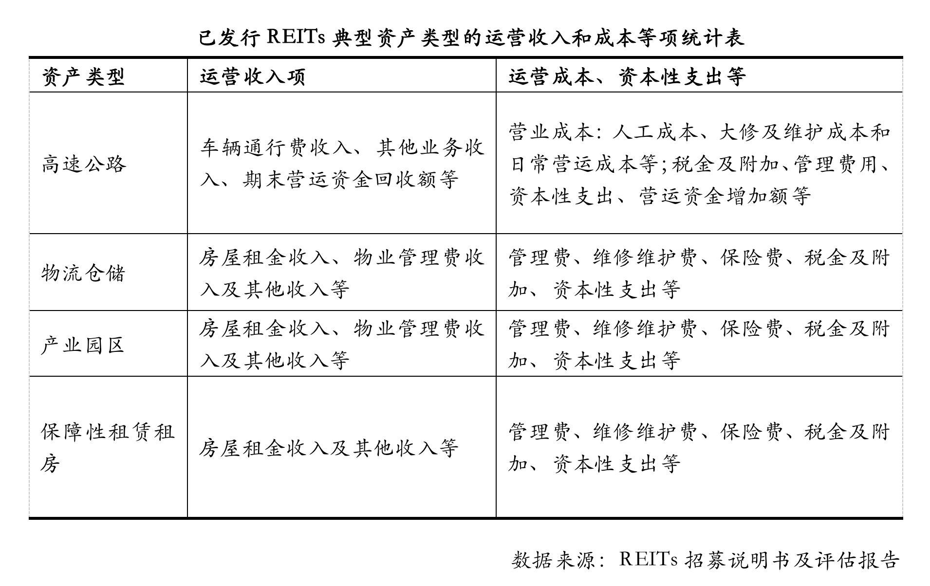 基礎(chǔ)設(shè)施資產(chǎn)未來(lái)可帶來(lái)穩(wěn)定、可預(yù)期的收益。未來(lái)預(yù)期收益是運(yùn)用收益法評(píng)估資產(chǎn)價(jià)值的基本參數(shù)之一。其主要通過(guò)預(yù)測(cè)資產(chǎn)未來(lái)各期的運(yùn)營(yíng)收入和運(yùn)營(yíng)成本、資本性支出等進(jìn)行測(cè)算,主要難度在于未來(lái)各期收入與支出的變化率的分析和判斷,這需要評(píng)估人員具有專業(yè)的分析和技術(shù)能力。不同的資產(chǎn)類型預(yù)期收益的測(cè)算過(guò)程差異較大,下面是已發(fā)行REITs的典型資產(chǎn)類型的運(yùn)營(yíng)收入項(xiàng)和運(yùn)營(yíng)成本、資本性支出項(xiàng)內(nèi)容: